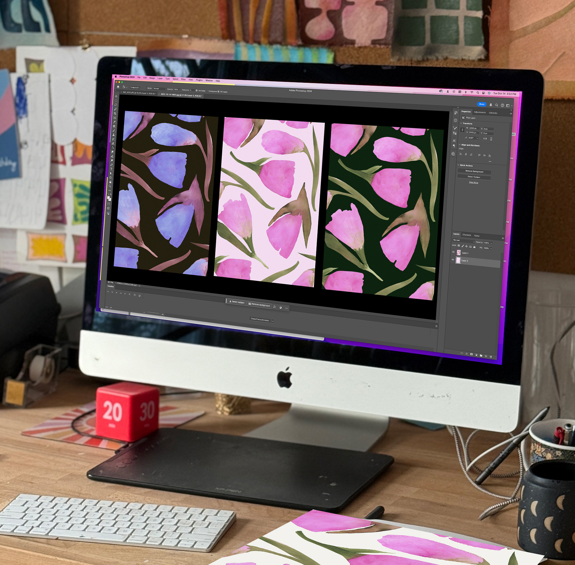 The final stage of my process always involves experimenting digitally with color, scale, and composition. Using Adobe Photoshop and Illustrator, I refine each print into its finished form—creating seamless repeats, engineered placements, and color separations. I also prepare detailed technical packages to ensure every design is production-ready.